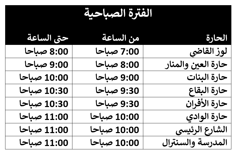 فيما يلي جدول الساعات المسموح فيها إخراج النفايات من المنازل من يوم الإثنين حتى مساء السبت بفترتين صباحية ومسائية حسب الشوارع والحارات.